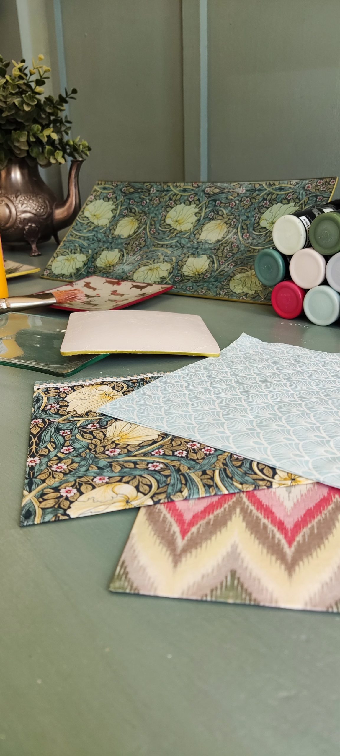 Taller de 3 horas para aprender a hacer decoupage sobre dos bandejas de cristal perfectas para servir alimentos, dejar tus joyas o llaves.